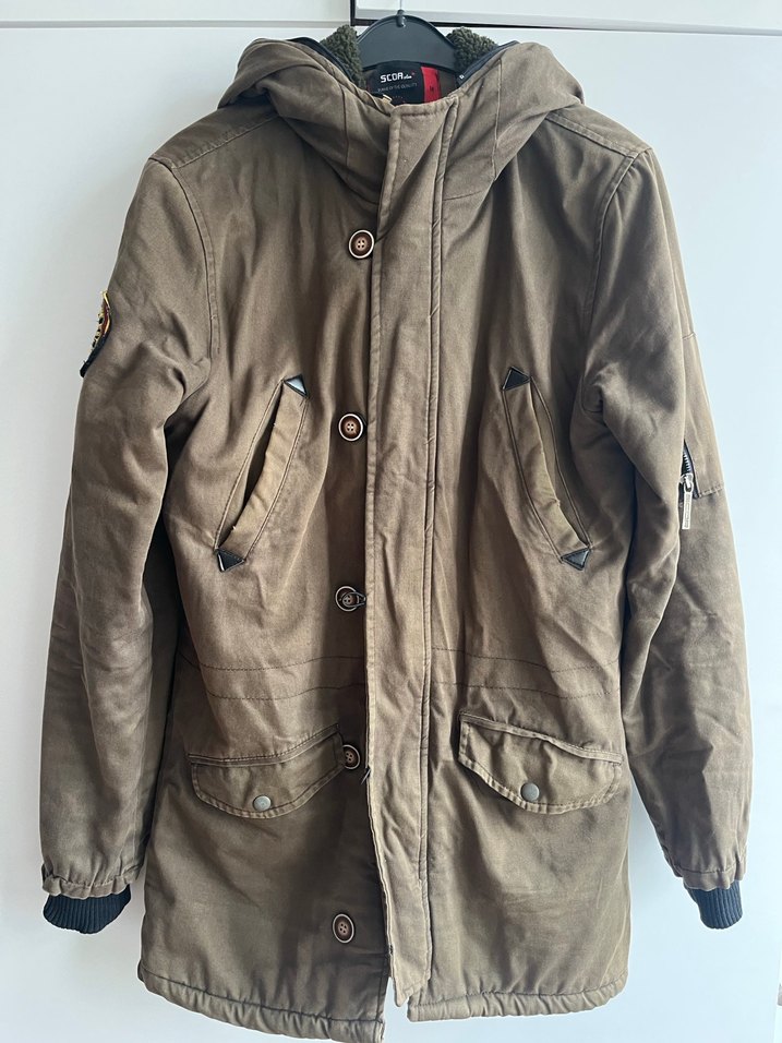 Erkek için tasarlanmış, düğmeli ve haki renkte süet kaban. Notched lapel yakalı, bol kesim ve kapüşonlu, sokak stiline uygun rahat bir modeldir.