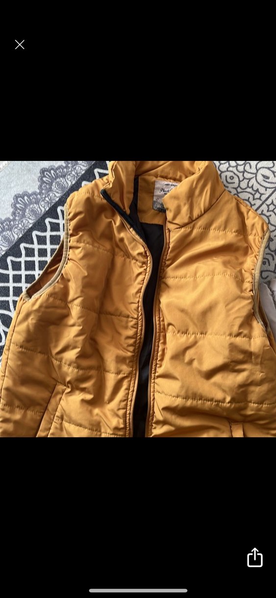 Hardal renkli, fermuarlı ve straplez yaka tasarımlı, erkekler için normal kesim yelek.