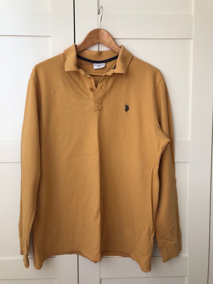 Erkek uzun kollu polo tişört, yakalı ve bol kesimdir. Yumuşak ve sıcak kumaştan, hardal renkte, günlük sokak stili için uygundur.