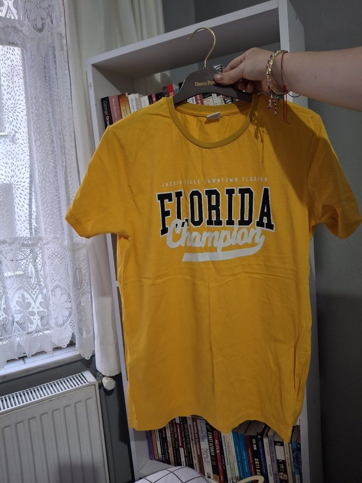 Sarı renkli tişört, kısa kollu, bol kesim ve yuvarlak yaka. Pamuklu ve parlak kumaş üzerine baskılı 'FLORIDA Champion' yazısı bulunur.