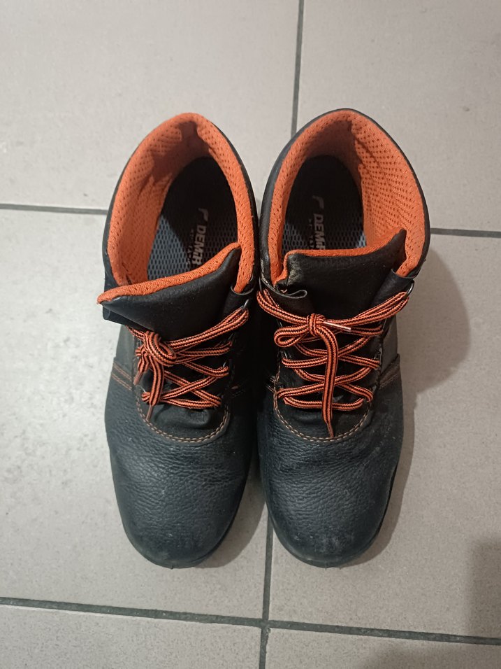 Az giyilmiştir ama hiçbir problemi yoktur sağlam Turuncu bağcıklı, koyu renkli erkek spor botları. Athleisure tarzında, desen içermeyen sokak giyimi ayakkabısı.