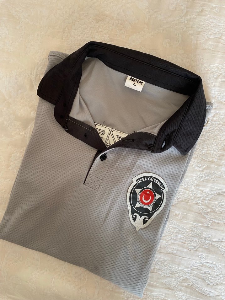 Düğmeli, baskılı gri erkek polo tişört, kısa kollu ve yakalıdır. Yumuşak ve sıcak kumaştan, günlük sokak giyimine uygundur.