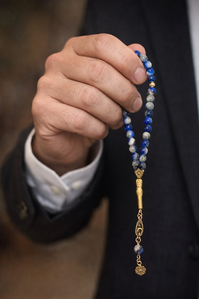 Koyu mavi renkli, iş tarzına uygun klasik erkek tesbihi. Parlak boncuklar ve püskülü ile günlük kullanıma uygun.