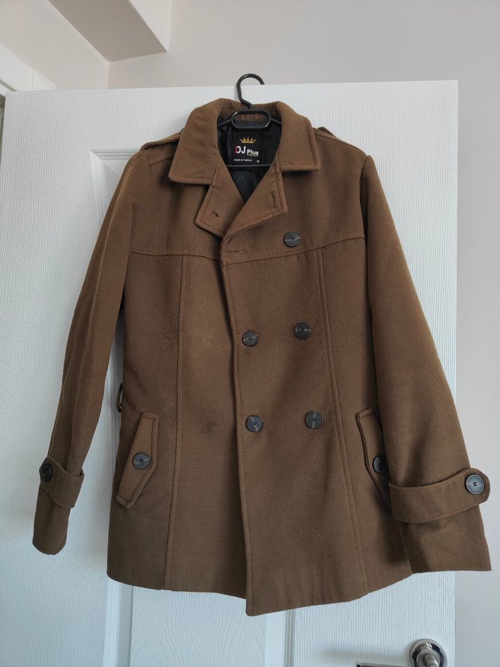 Kahverengi süet erkek kaban, düğmeli ve kesik yaka detaylıdır. Normal uzunlukta, uzun kollu ve rahat kesimdir.kucuk düğme yeri değişiminden hafif iz vardır