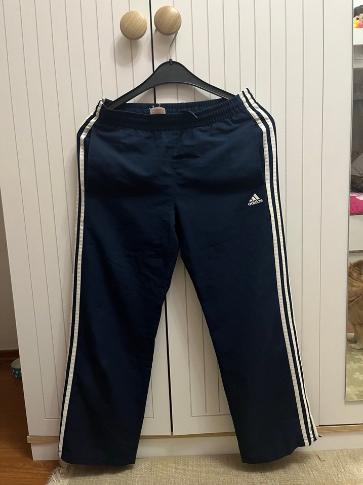 Lacivert renkli orijinal Hiç giyilmedi Düşük paçaları açılıyor beyaz yan şeritli ve cırt cırtlı detaylı erkek kadın bol kesim eşofman altı, denim görünümlü kumaştan üretilmiştir. Sokak stili için uygundur.