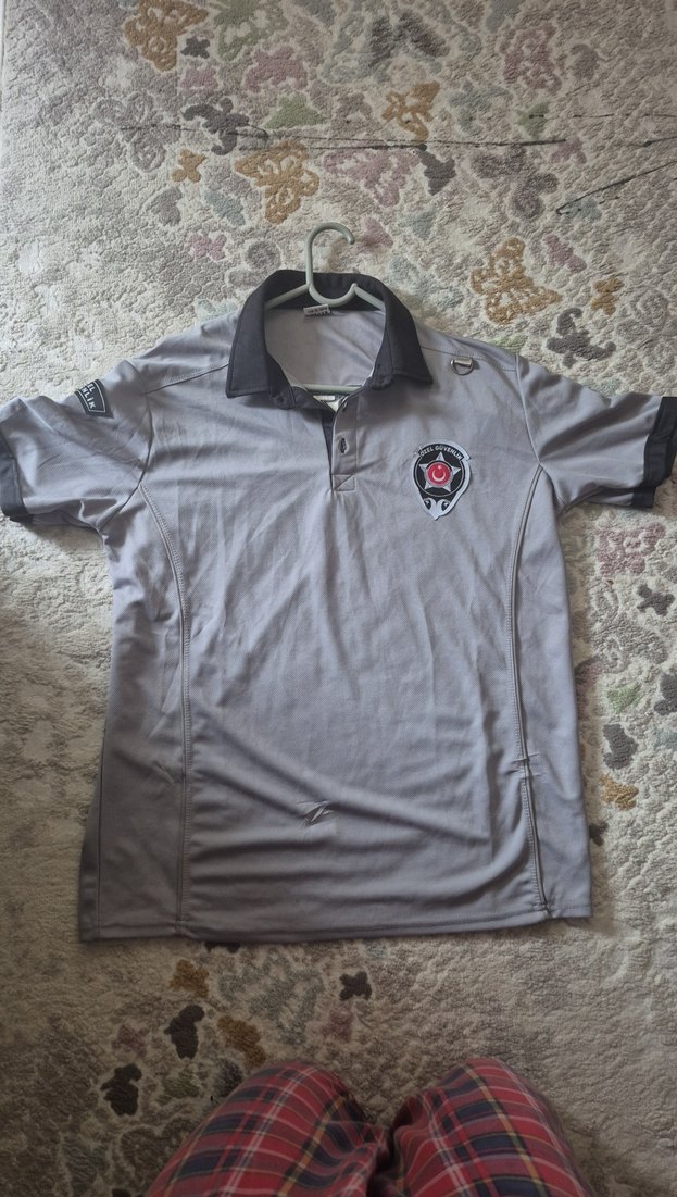 Erkekler için gri, kısa kollu, bisiklet yaka ve düğmeli detaylara sahip özel güvenlik baskılı tişört. Sentetik kumaştan, dar kesim ve normal boyda. ️