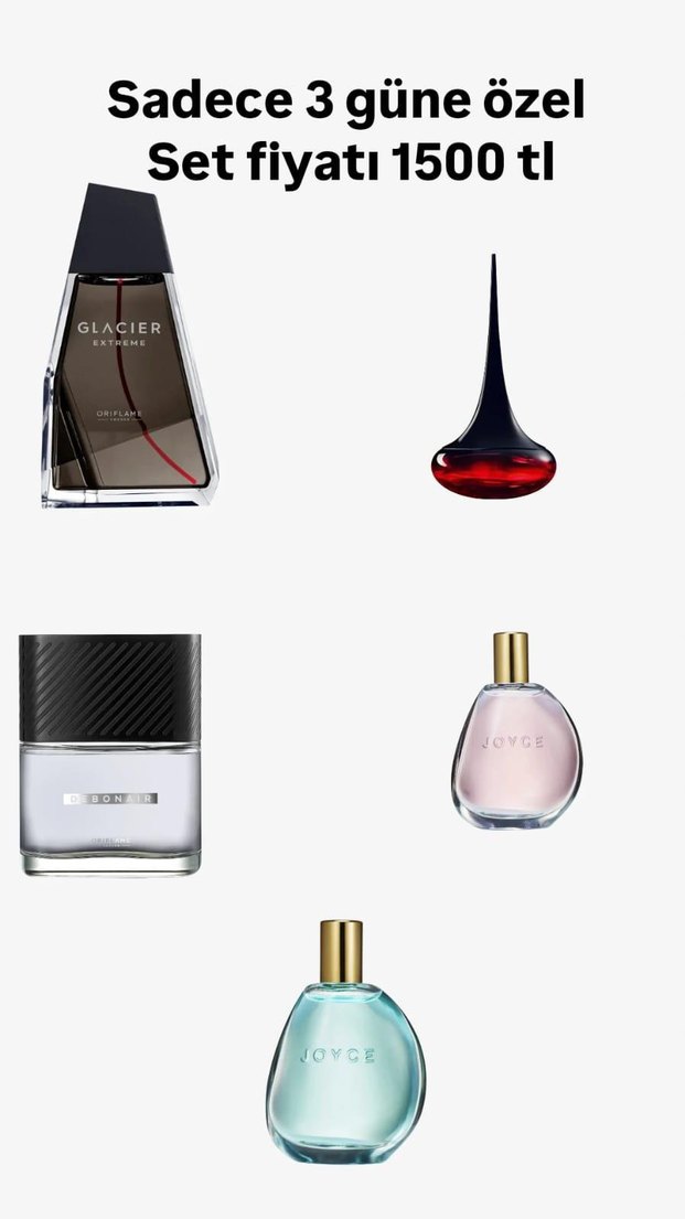 Farklı kokularda beşli erkek kadın parfüm seti, toplam fiyatı 1500 TL. Çeşitli şişe tasarımları ve kokular içerir.