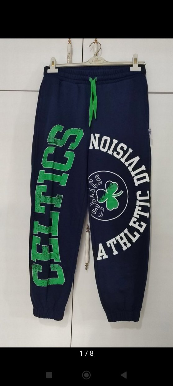 Erkek ve kadınlar için rahat kesim, lacivert renkli, yeşil baskılı yumuşak dokulu eşofman altı. Elastik bel ve paça bilekliği bulunur.