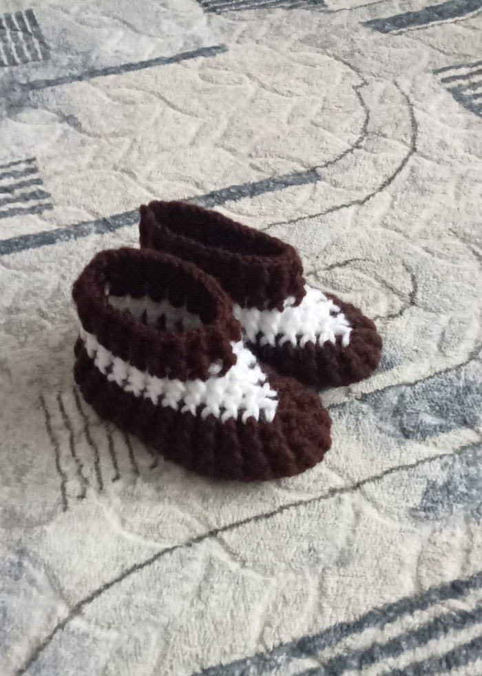 Erkek ve kadınlar için el örgüsü, koyu kahverengi ve beyaz renklerde, yumuşak ve rahat patikler. Düz, sade tasarıma sahip, günlük kullanım için uygun.