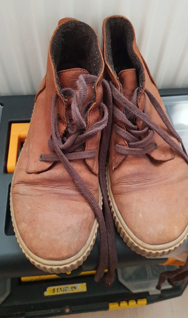 Gri tonlarında kahverengi bağcıkları ve sağlam tabanı olan erkek günlük kahverengi ayakkabı.