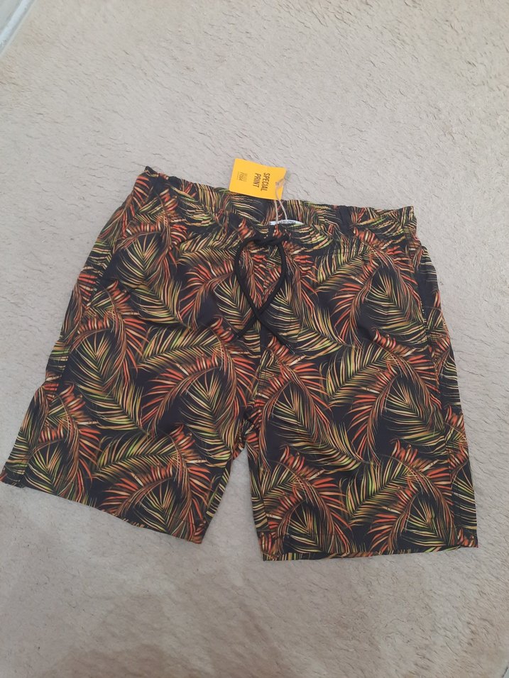 yeni ve etiketli kalibi s-m ara beden uyumlu yanda ve arkada cepleri vardir kahverengi tonlarında yaprak desenli, lastikli bel detayına sahip rahat deniz şortu #mudo#denizşortu