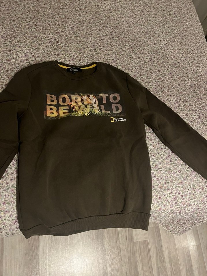 Kahverengi, uzun kollu, bol kesim erkek çocuk sweatshirtü. Baskılı tasarımlı, düğme detaylı ve pamuklu kumaştan üretilmiştir.