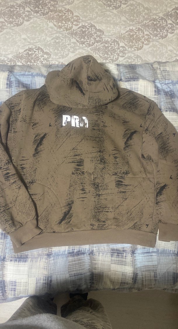 Erkek kahverengi sweatshirt, bol kesim, uzun kollu ve yuvarlak yaka. Baskılı desene sahip, yumuşak ve sıcak kumaştan üretilmiştir. Günlük kullanım için uygundur.