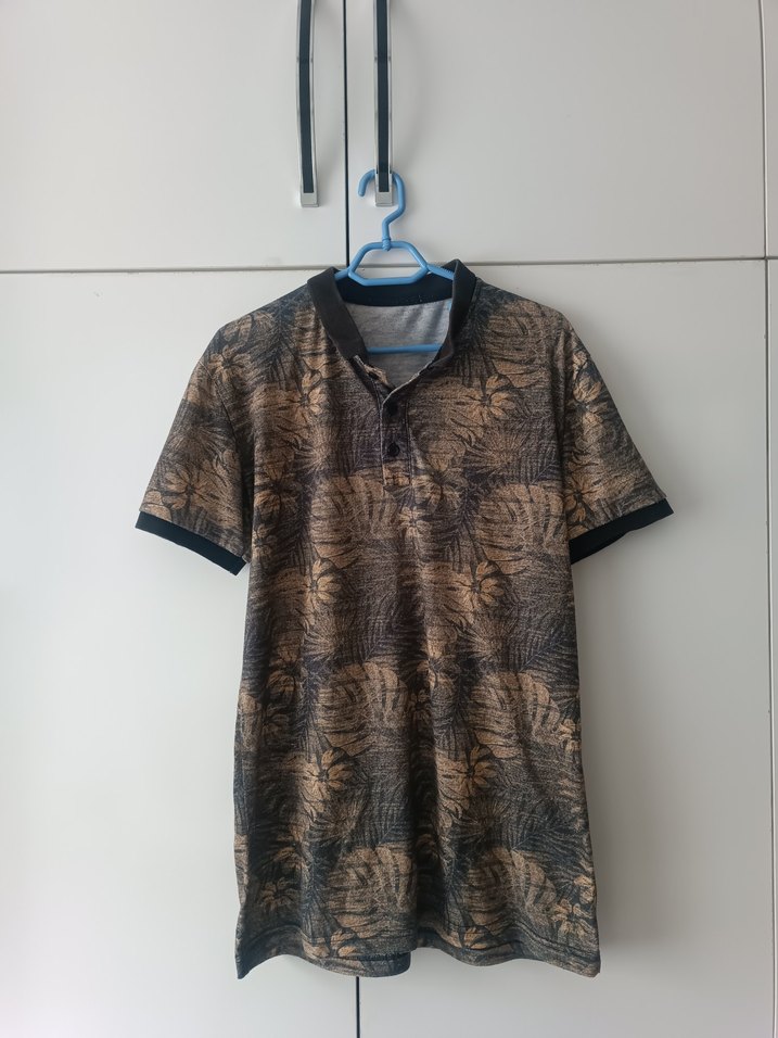 Kahverengi ve gri batik desenli, kısa kollu, yakalı ve düğmeli erkek polo tişörtü. Bol kesim ve normal boyda, rahat sokak stili için uygun.