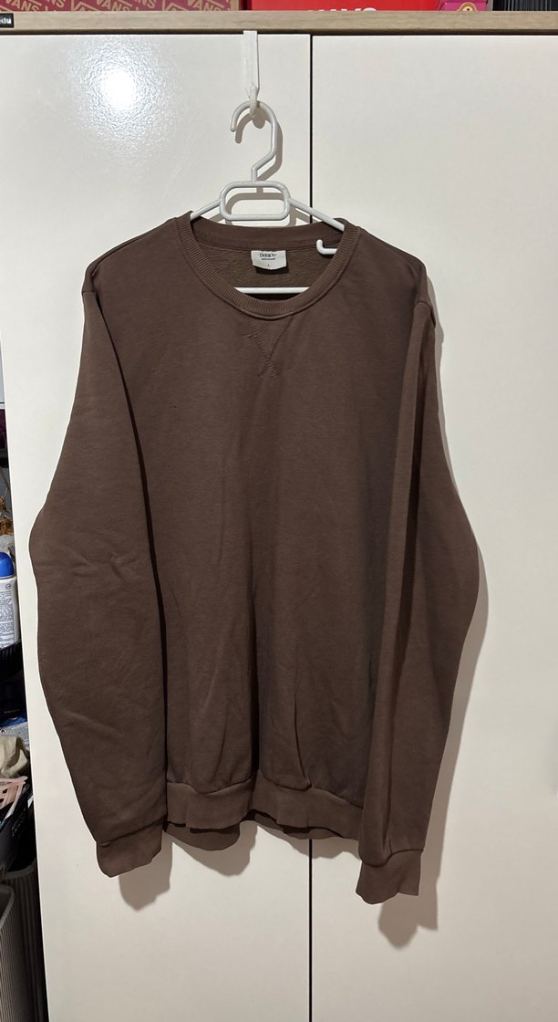 Erkek kahverengi bisiklet yaka sweatshirt, uzun kollu ve rahat kesimli. Yumuşak keten kumaştan, gündelik ve sokak stili için uygun.