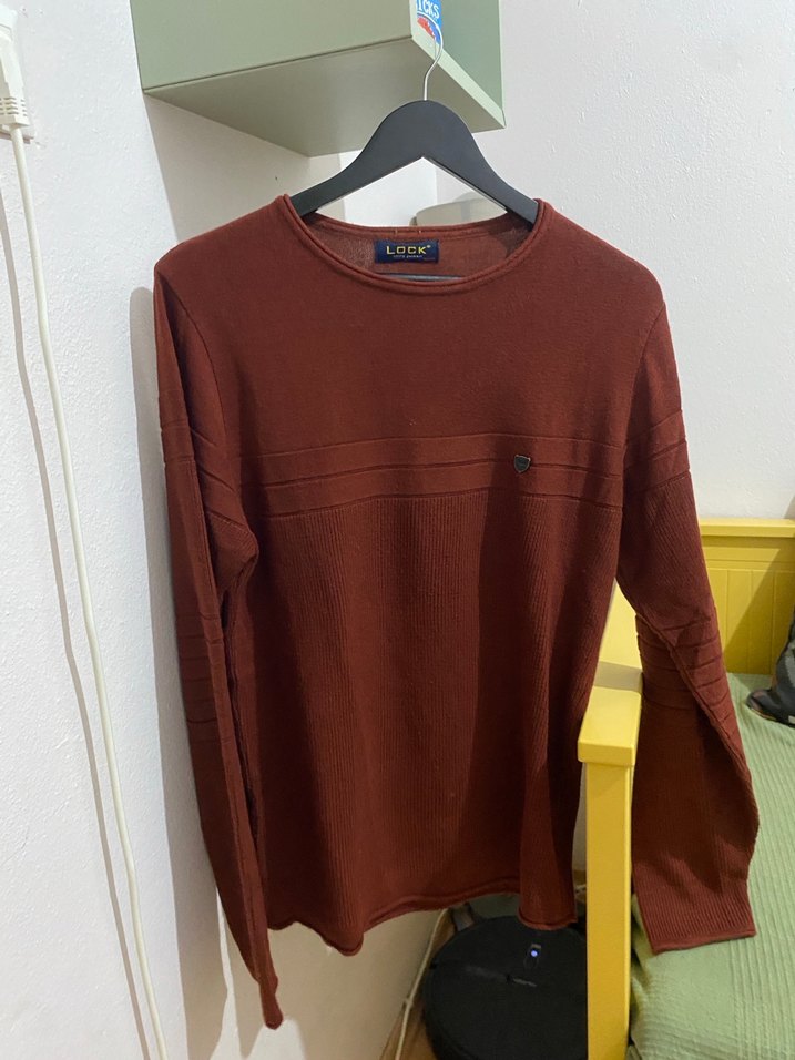 Bu erkek kazak, bisiklet yaka ve uzun kollu, bol kesimdir. Yumuşak ve sıcak dokuma kumaştan, koyu kahverengi renkte, günlük rahat sokak stiline uygundur. Desensizdir.