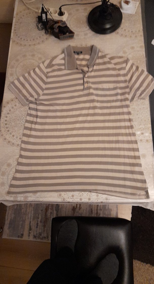 Kahverengi ve gri çizgili, L Beden kumaştan yapılmış, kısa kollu, düğmeli yakalı, bol kesim erkek polo tişört. Rahat günlük kullanım için uygundur.