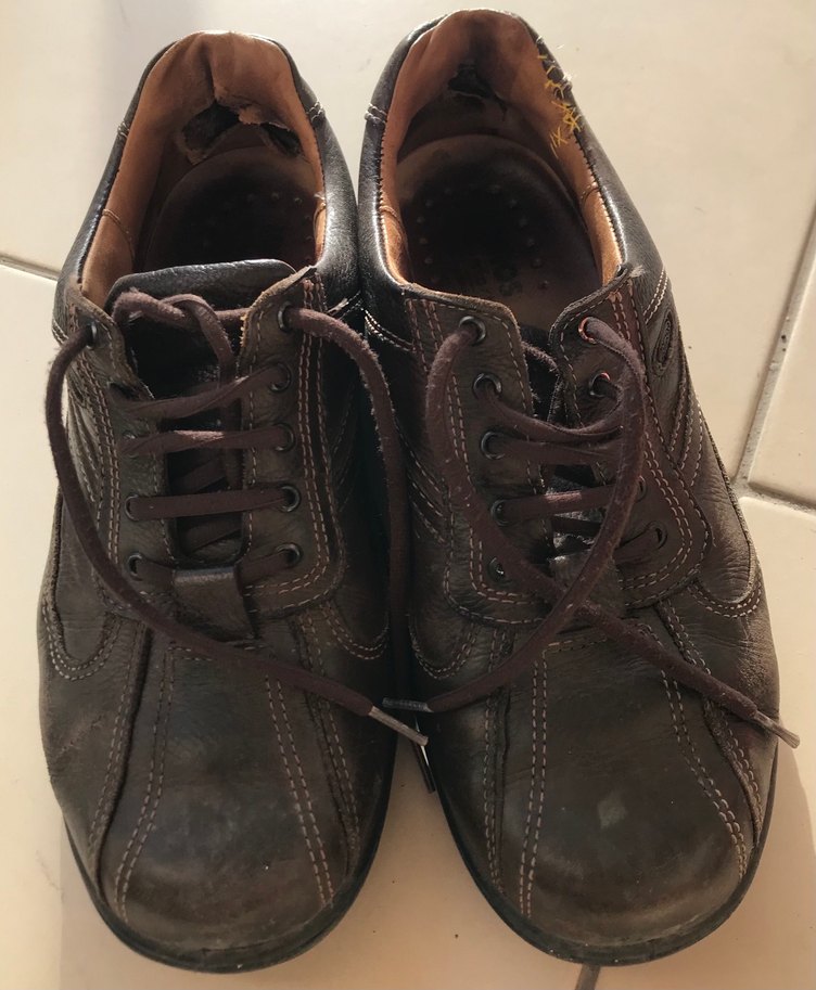 Erkek ayakkabı kahverengi bağcıklar, normcore sokak stiline uygun günlük Rahat deri ayakkabı. Ökçe kısımında hafif yıpranma, sol arkada küçük onarım.