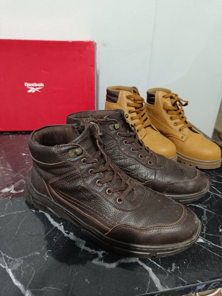 Koyu kahverengi deri erkek bot, bağcıklı tasarıma sahip. Sokak stili ve günlük kullanım için sağlam ve rahat bir seçenek.
