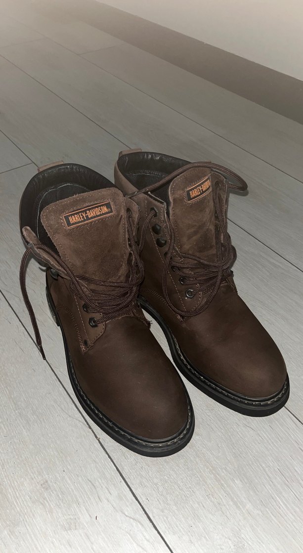 Koyu kahverengi deri biker botlar, tokalı detaylara sahip, trend sokak stiline uygun günlük kullanıma uygun.