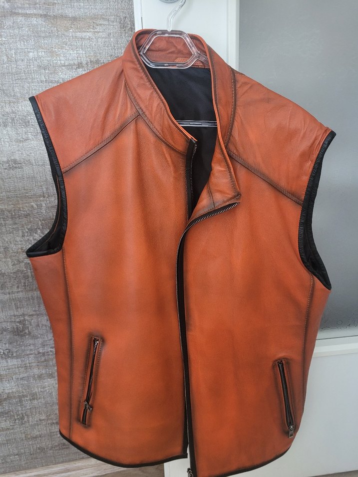 Parlak kahverengi deri biker yelek, yüksek yakalı ve fermuarlı ceplidir. Günlük kullanıma uygun, regular fit ve kolsuz tasarıma sahiptir. Kemal tanca orjinal deri L,bedene,de uyumlu