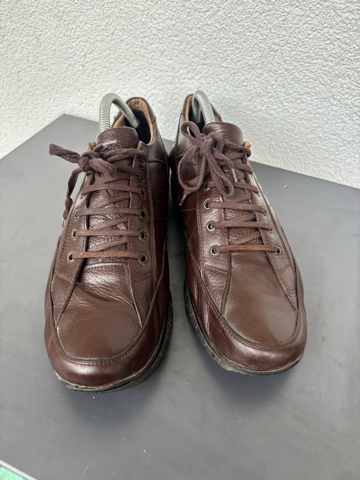 Koyu kahverengi deri erkek spor ayakkabı, bağcıklı ve rahat sokak stili tasarımına sahip. Günlük kullanım için dayanıklı ve konforlu.