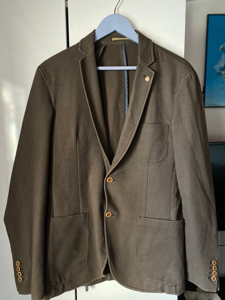Erkek kahverengi ceket, düğmeli, uzun kollu ve normal uzunlukta. Notched lapel yaka ve regular fit kesimle ofis kullanımı için uygundur.