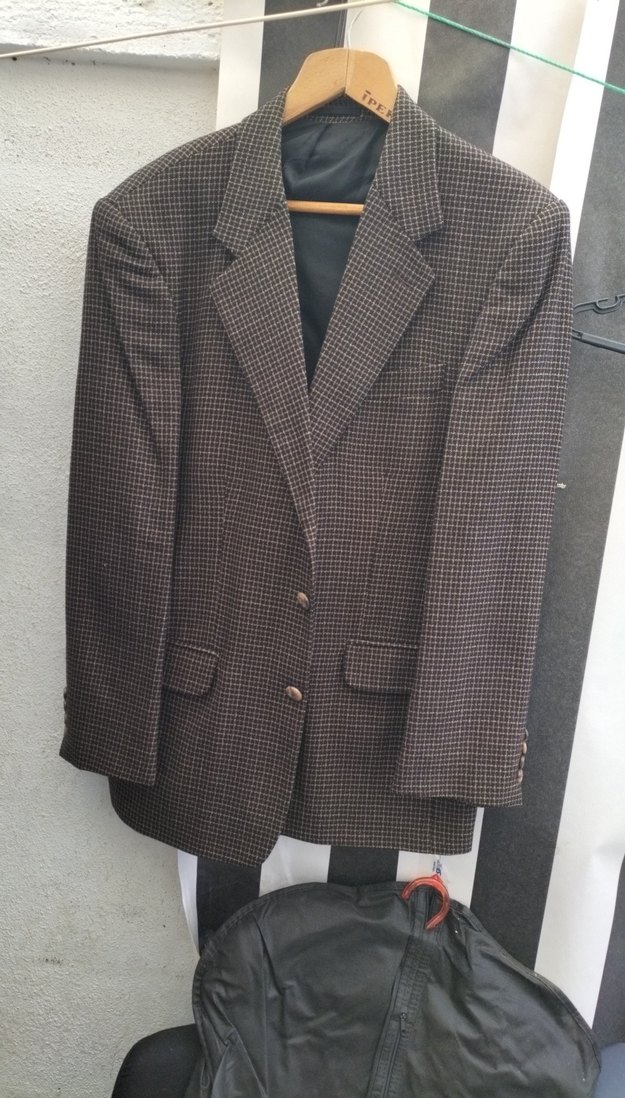 Bu erkek ceketi, kahverengi sentetik kaşe kumaş, dik yaka ve normal kesime sahiptir. Uzun kollu, düğmeli ve midi boydadır, ofis için uygundur. iki koltuk arası 52cm uzunluğu 75cm kol omuzdan aşağı 60cm