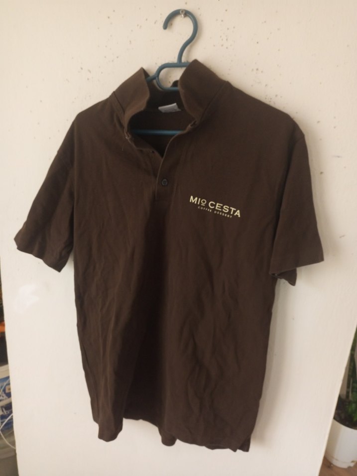 Bu erkek kahverengi polo tişört, düğmeli ve yakalıdır. L bedendir, pamuklu, bol kesim ve 'MICESTA' baskılıdır. Günlük sokak giyimi için uygundur.