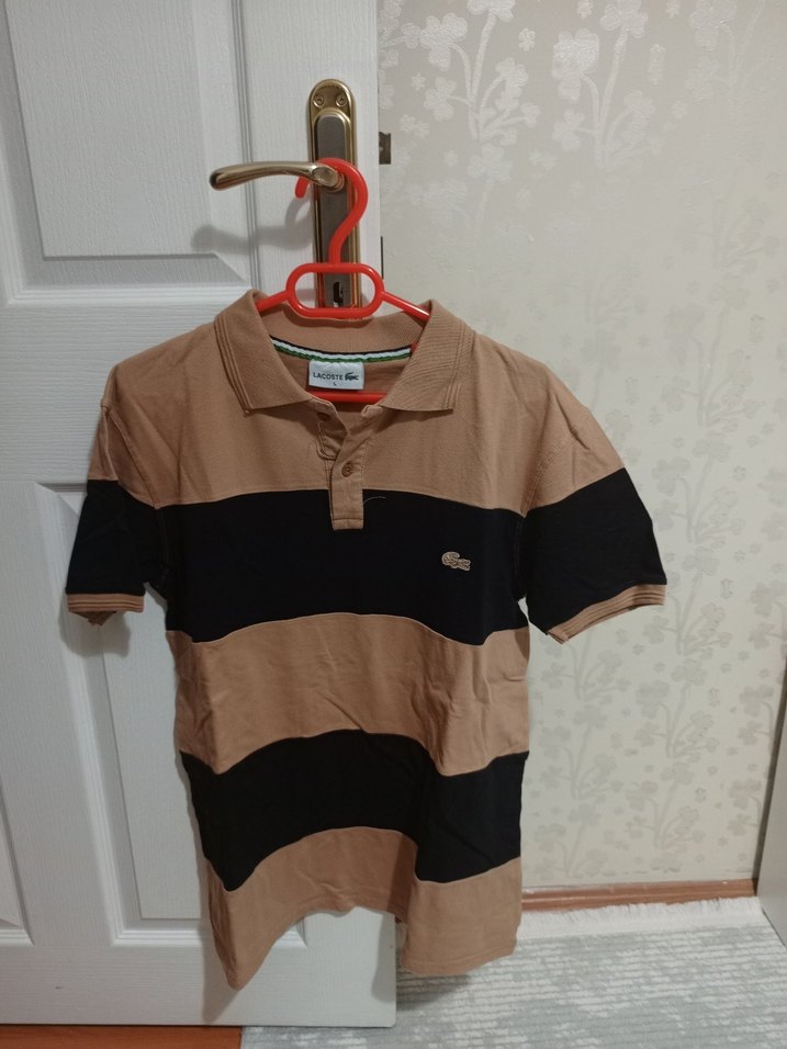Erkek kahverengi ve siyah geniş çizgili kısa kollu polo tişört, düğmeli ve yakalı, rahat kesim, sentetik kumaştan üretilmiştir.
