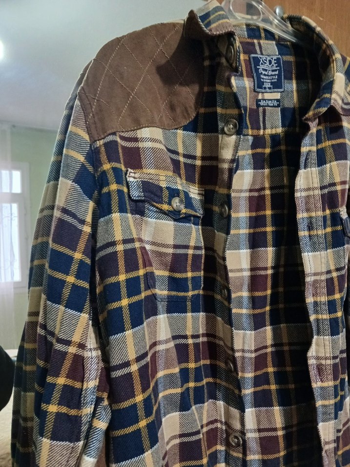 Erkekler için uzun kollu, düğmeli gömlek. Kahverengi ekose deseni ve düz omuz detaylarıyla rahat kesim, günlük kullanıma uygun.