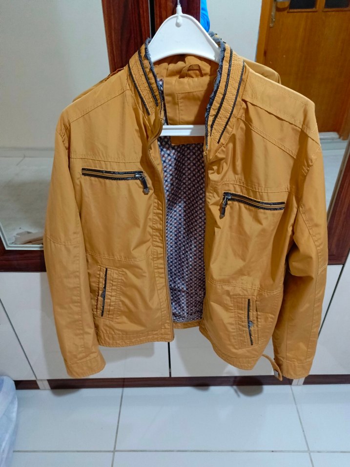 Erkek hardal rengi montun parlak sentetik kumaşı, fermuarlı cepleri ve regular kesimi vardır. Uzun kollu, normal uzunluktadır, günlük kullanıma uygundur. Görünürde göze çarpan bariz defoları olmasada göze batmayan yerlerde defoları vardır.