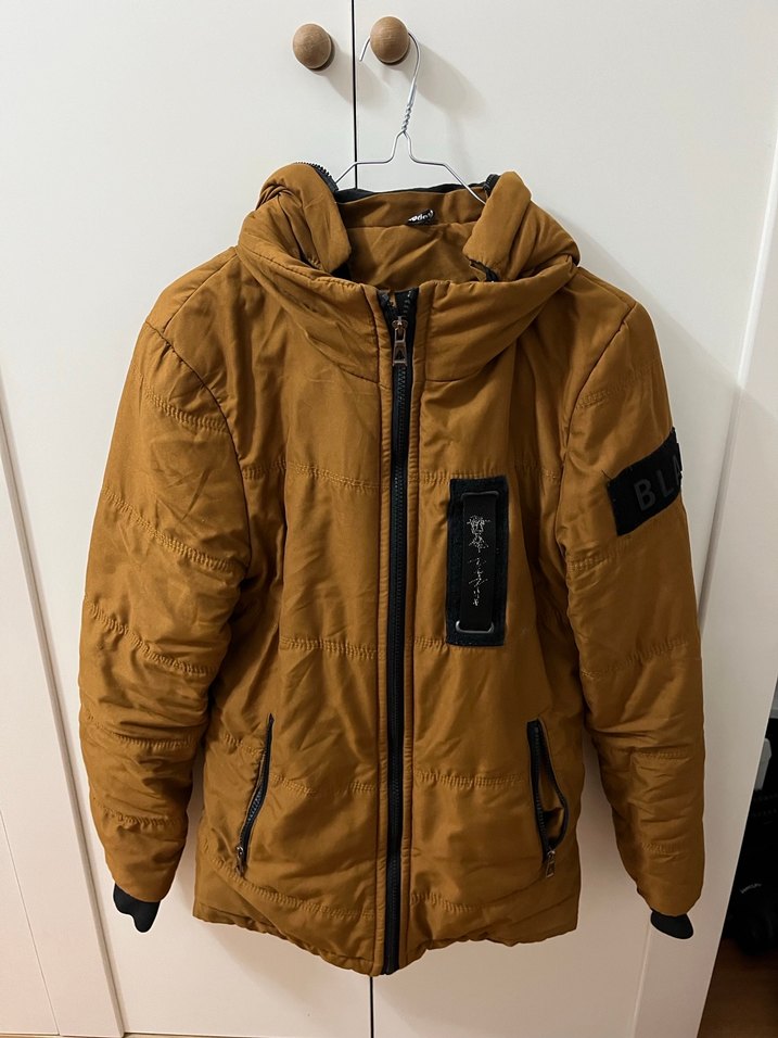 Koyu kahverengi, fermuarlı cepli mont çok az kullanıldı.