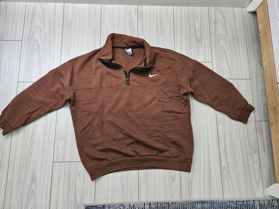 Erkek kahverengi sweatshirt, bol kesim, yuvarlak yaka ve uzun kolludur. Yumuşak ve sıcak kumaştan yapılmış, fermuar detayı bulunur. Günlük kullanıma uygundur.