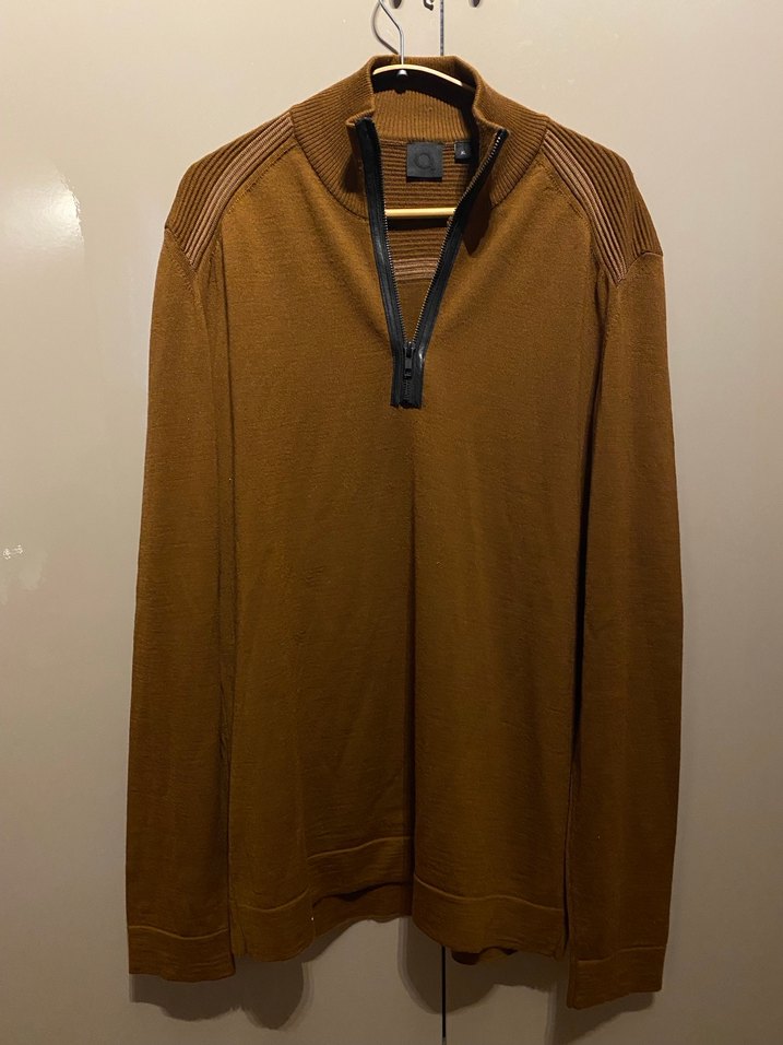 Erkek kahverengi deri detaylı, fermuarlı yarım balıkçı yaka kazak. Uzun kollu, normal kesim, Que marka, çok az kullanıldı, defosu yok.