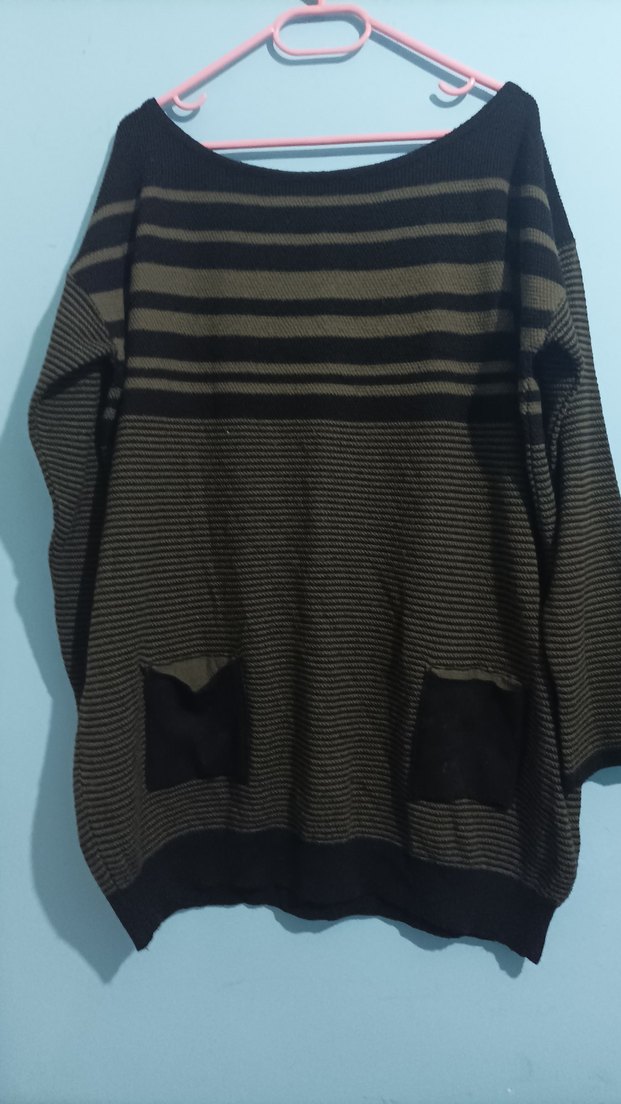 erkekleriçin uzun kollu, kayık yaka, kahverengi ve gri çizgili triko kazak. Rahat kesimi ve midi boyu ile günlük sokak tarzına uygundur.