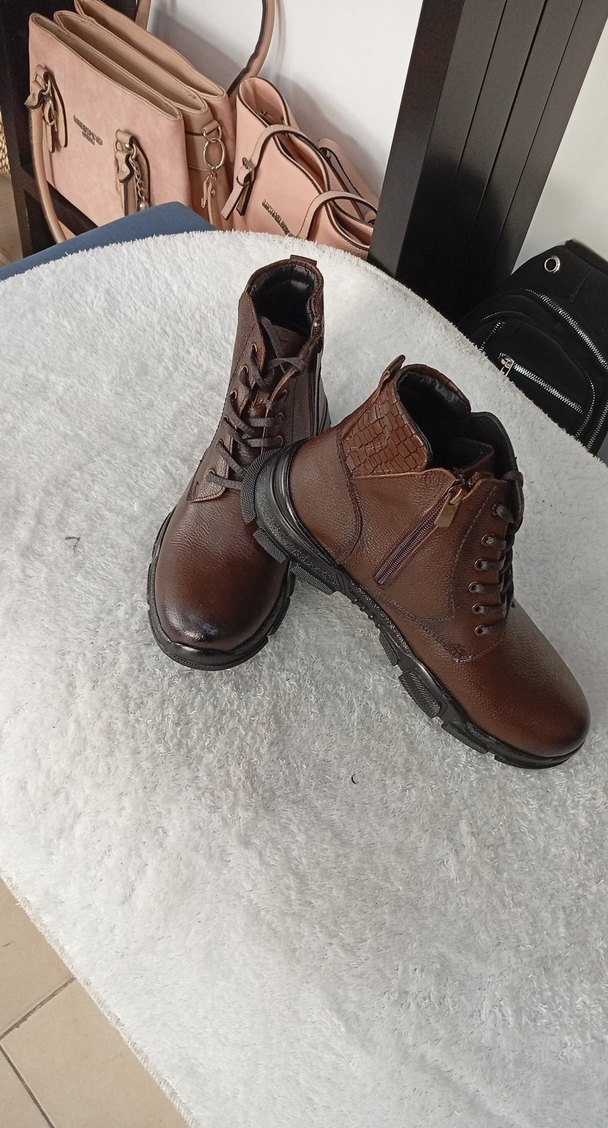 Kahverengi deri kemerli erkek botları, günlük sokak stiline uygun rahat ve trend görünüme sahip.
