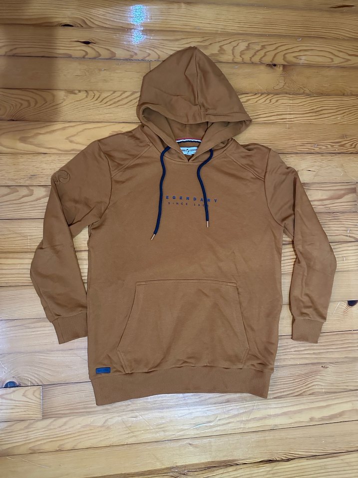 Erkekler için uzun kollu, bol kesim, koyu kahverengi kapüşonlu sweatshirt. Yumuşak ve sıcak kumaştan, önünde küçük logo ve kanguru cep bulunur.