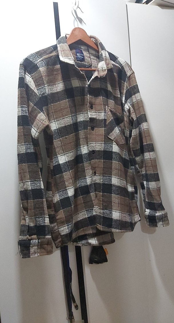Düğmeli, uzun kollu ve bol kesim erkek gömleği. Yumuşak yün kumaştan, kahverengi kareli desene sahip, günlük sokak stiline uygun.