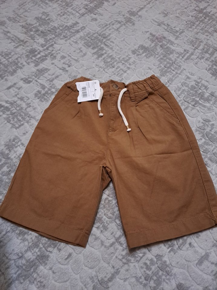 Yumuşak keten kumaştan yapılmış, kahverengi, erkek şort. Rahatlık için bağcıklı bel. Trendy rahat sokak stili için uygundur.