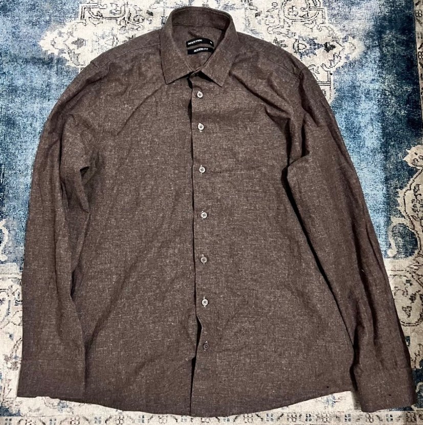 Kahverengi keten kumaştan, uzun kollu ve düğmeli erkek gömleği. Notlu yaka ve regular fit ile ofis veya günlük sokak stiline uygun.