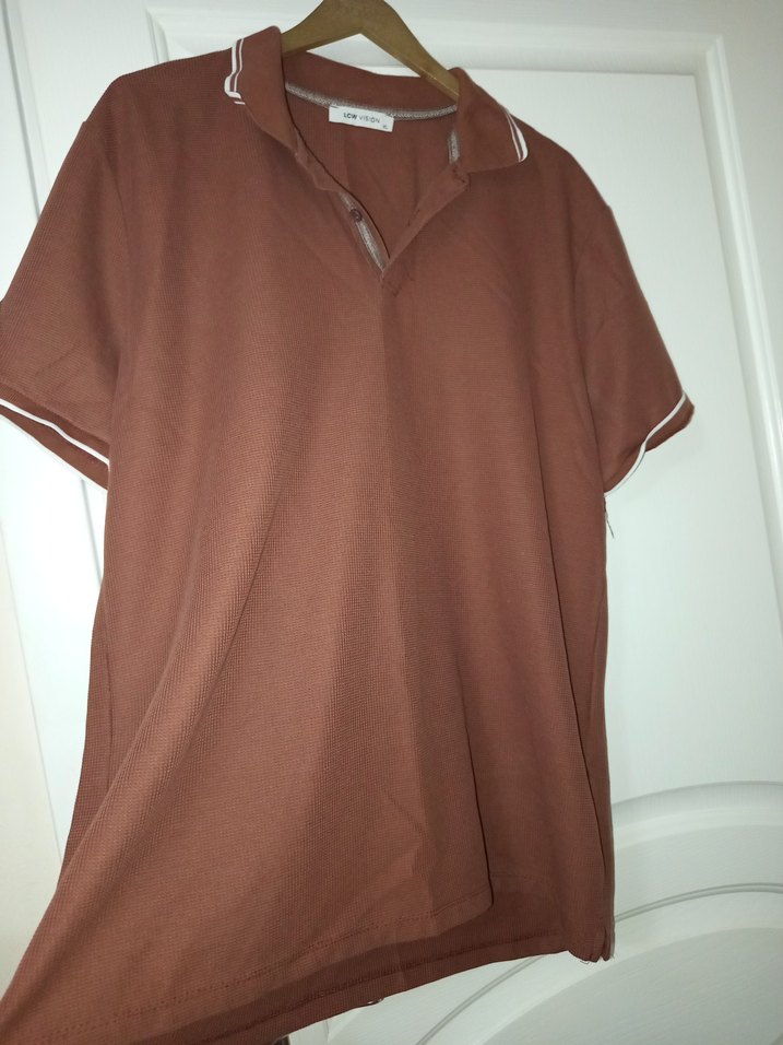 Kısa kollu, yakalı ve bol kesimli erkek polo tişörtü. Parlak kahverengi pumuklu kumaştan, desen içermeyen rahat ve şık bir günlük parça.