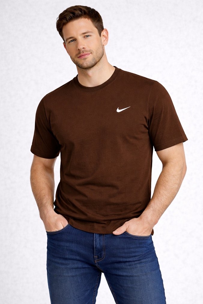 Erkek kahverengi kısa kollu tişört, yuvarlak yaka ve normal kesime sahiptir. Yumuşak süet kumaştan üretilmiş, gündelik sokak stili ve zahmetsiz şıklık sunar. Günlük kullanım için uygundur, koyu renkte ve desensizdir.