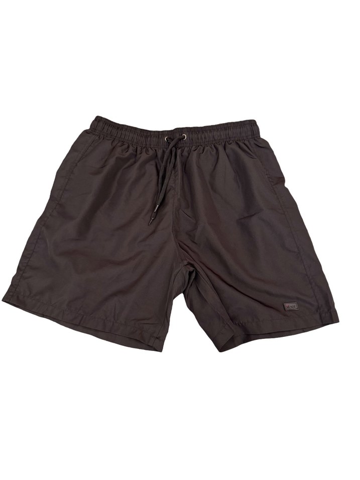 Kahverengi, bol kesim, mini boy erkek yüzme şortu. Düz tasarımı ve rahat stiliyle plajda kullanıma uygundur.