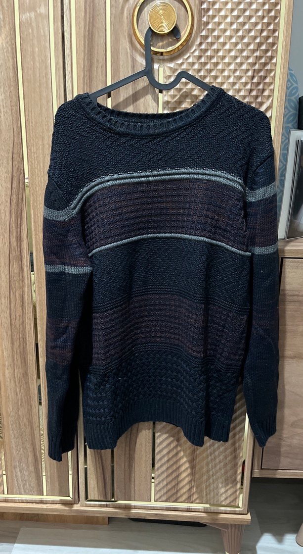 Erkekler için yuvarlak yaka, uzun kollu ve bol kesim olan, koyu kahverengi tonlarında örgü kumaştan yapılmış kazak. Rahat ve günlük kullanıma uygun.