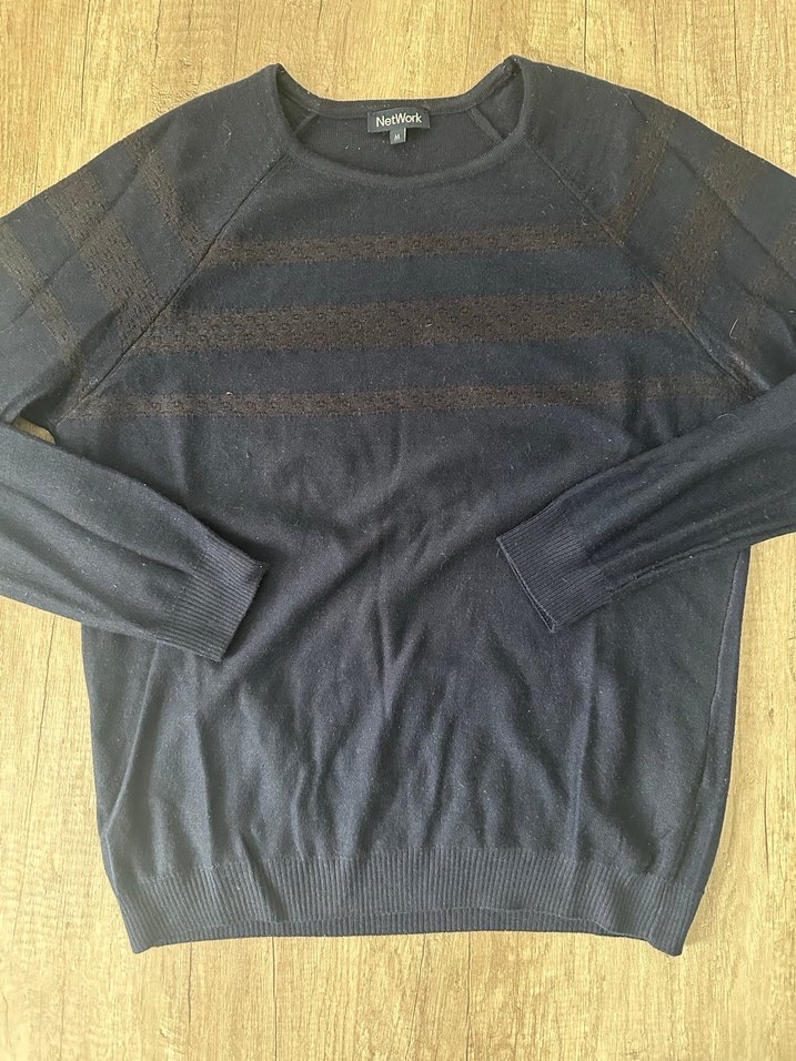 Bu erkek kazak, yuvarlak yaka ve uzun kollu olup rahat kesimdir. Yumuşak yünden örülmüş, lacivert renkte, günlük sokak stiline uygundur.