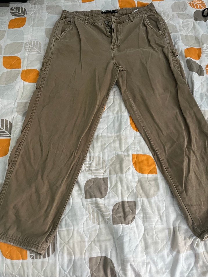 Erkekler için bol kesim, kahverengi pantolon. Sentetik kumaştan, günlük kullanım için rahat ve şık bir görünüm sunar. Paça boyu 97 cm