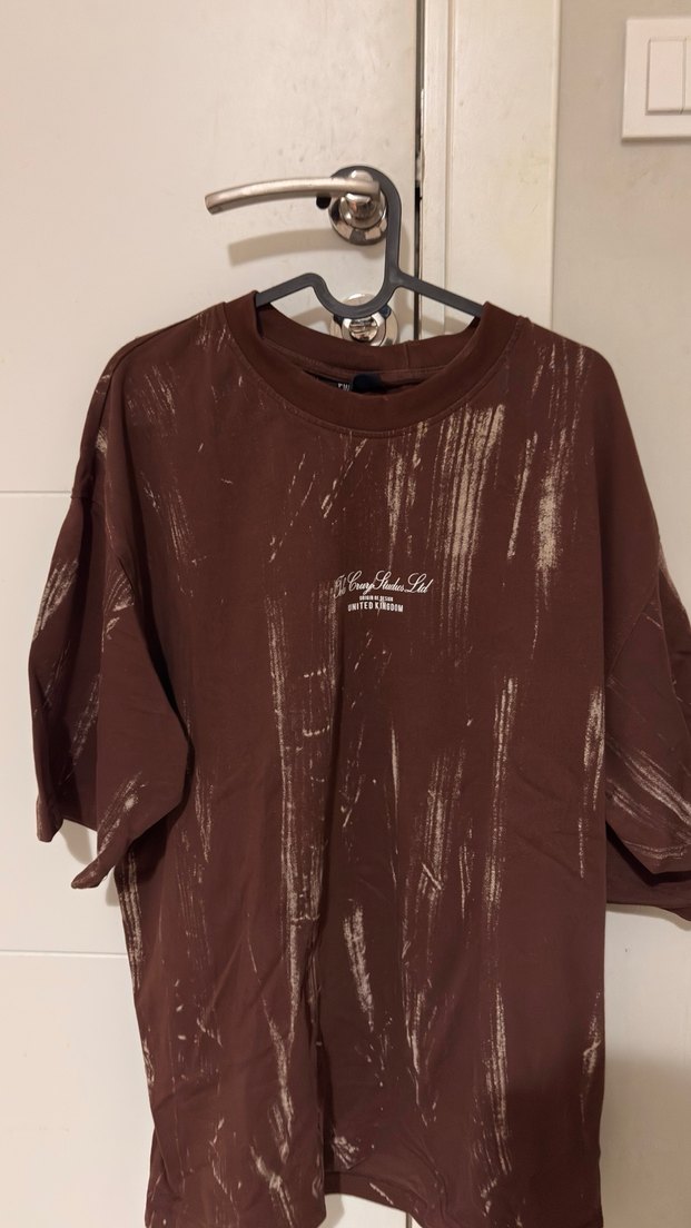 Erkek kahverengi, kısa kollu, yuvarlak yakalı, bol kesim tişört. Saten görünümlü kumaş ve parlak baskı deseniyle gündelik şıklık sunar.