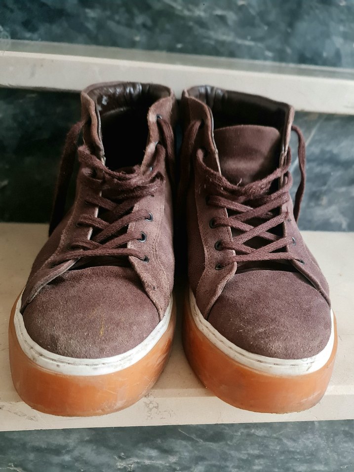 Kahverengi süet malzemeden yapılmış, turuncu tabanlı erkek sneakers. Sokak stili ve zahmetsiz şıklık sunar, günlük kullanım için uygundur.