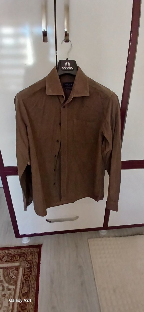 Erkek kahverengi süet gömlek, kırlangıç yaka ve düğmeli öne sahiptir. Regular fit, uzun kollu ve normal boydadır, ofis için klasik sokak tarzı sunar.